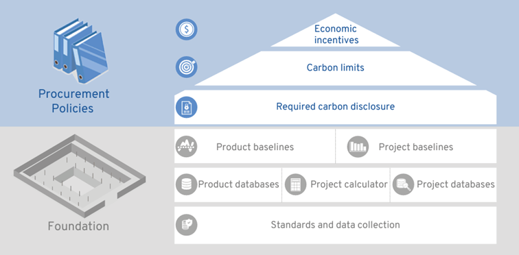 The first component of the framework is the foundation, which includes establishing standards for reporting emissions, databases and tools for tracking emissions and establishes baselines. The second part of the framework, procurement polices builds upon and reinforces the foundation by setting policies that require environmental disclosures, mandate carbon limits, and incentivize low-carbon design, and use of low-carbon materials.